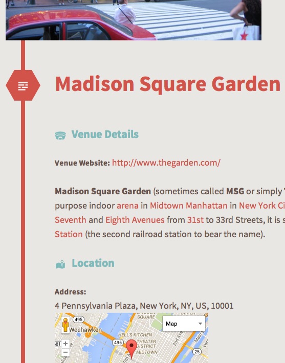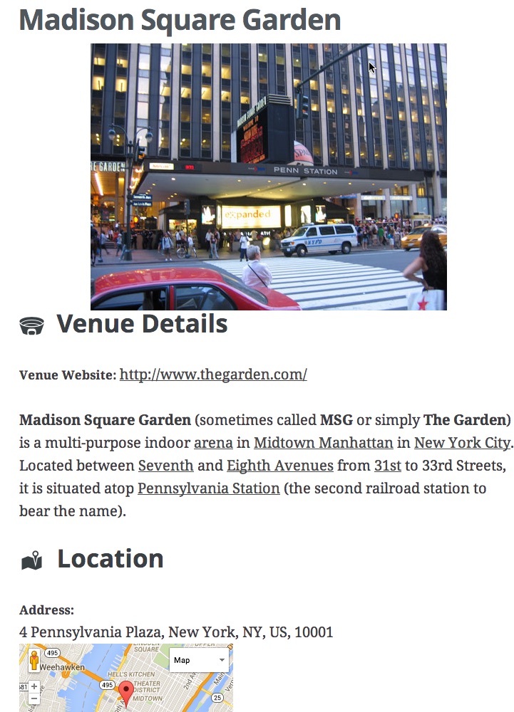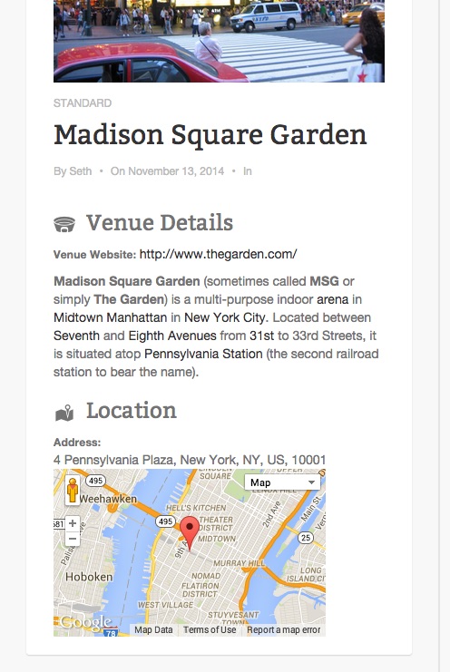Event Smart is packaged with a Venue archive page which lists all the published venues. The venue single archive page lists the details about a single venue.